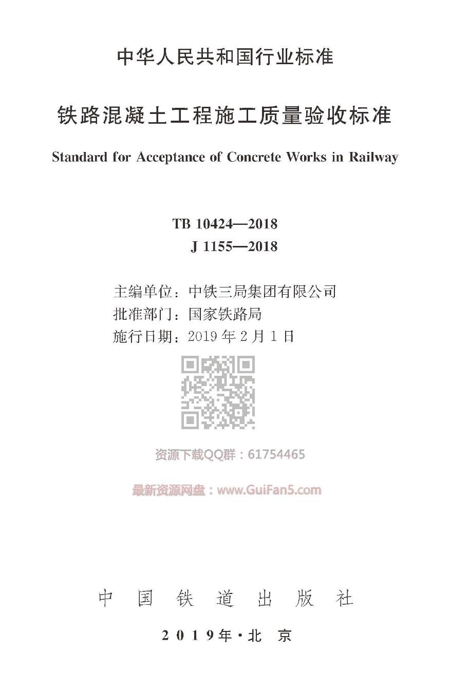 正版 TB 10424-2018 鐵路混凝土工程施工質量驗收標準(高清版)